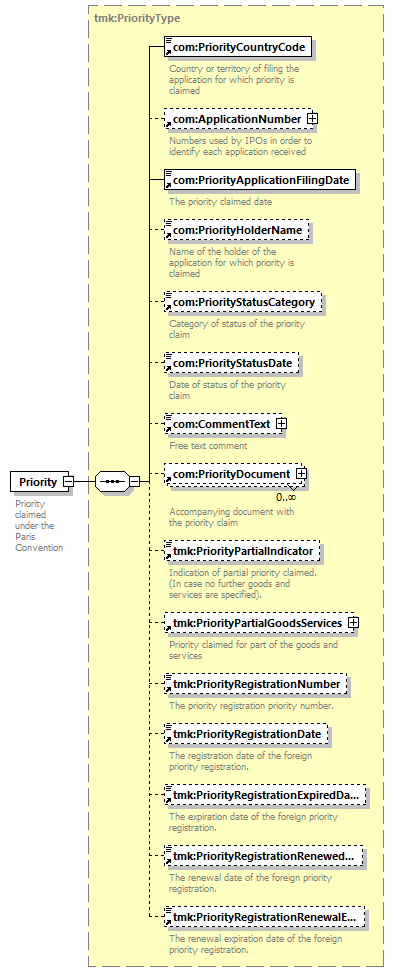 | children | com:PriorityCountryCode com:ApplicationNumber com:PriorityApplicationFilingDate com:PriorityHolderName com:PriorityStatusCategory com:PriorityStatusDate com:CommentText com:PriorityDocument tmk:PriorityPartialIndicator tmk:PriorityPartialGoodsServices tmk:PriorityRegistrationNumber tmk:PriorityRegistrationDate tmk:PriorityRegistrationExpiredDate tmk:PriorityRegistrationRenewedDate tmk:PriorityRegistrationRenewalExpiredDate | ||||