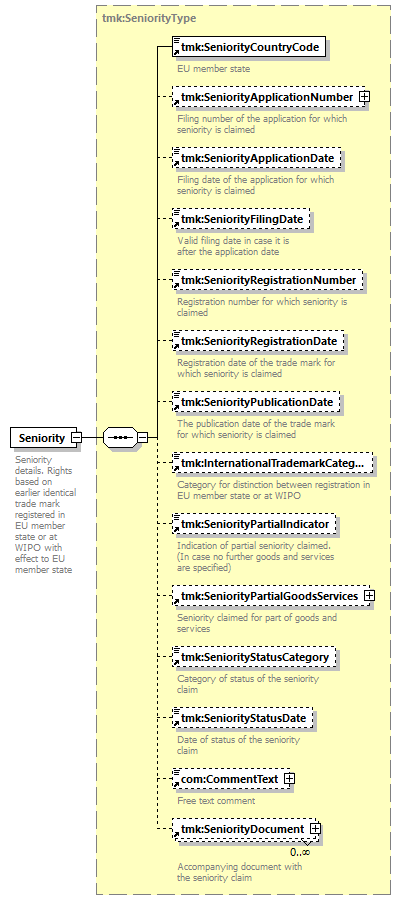 | children | tmk:SeniorityCountryCode tmk:SeniorityApplicationNumber tmk:SeniorityApplicationDate tmk:SeniorityFilingDate tmk:SeniorityRegistrationNumber tmk:SeniorityRegistrationDate tmk:SeniorityPublicationDate tmk:InternationalTrademarkCategory tmk:SeniorityPartialIndicator tmk:SeniorityPartialGoodsServices tmk:SeniorityStatusCategory tmk:SeniorityStatusDate com:CommentText tmk:SeniorityDocument | ||||