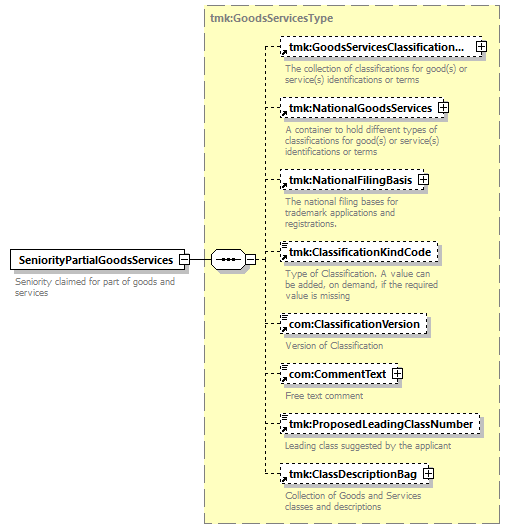 | children | tmk:GoodsServicesClassificationBag tmk:NationalGoodsServices tmk:NationalFilingBasis tmk:ClassificationKindCode com:ClassificationVersion com:CommentText tmk:ProposedLeadingClassNumber tmk:ClassDescriptionBag | ||||