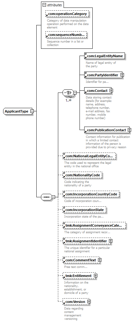 | children | com:LegalEntityName com:PartyIdentifier com:Contact com:PublicationContact com:NationalLegalEntityCode com:NationalityCode com:IncorporationCountryCode com:IncorporationState tmk:AssignmentConveyanceCategory tmk:AssignmentIdentifier com:CommentText tmk:Entitlement com:Version | |||||||||||||||||||||||||||||||||