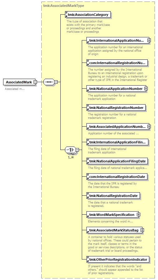| children | tmk:AssociationCategory tmk:InternationalApplicationNumber com:InternationalRegistrationNumber tmk:NationalApplicationNumber tmk:NationalRegistrationNumber tmk:AssociatedApplicationNumber tmk:InternationalApplicationFilingDate tmk:NationalApplicationFilingDate com:InternationalRegistrationDate tmk:NationalRegistrationDate tmk:WordMarkSpecification tmk:AssociatedMarkStatusBag tmk:OtherPriorRegistrationIndicator | ||||
