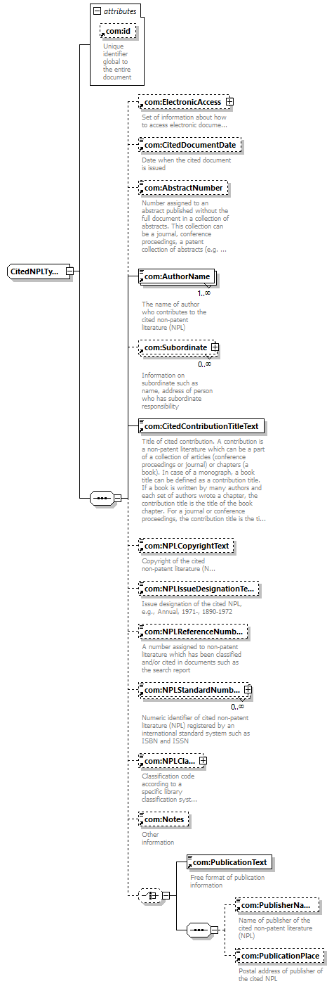 | children | com:ElectronicAccess com:CitedDocumentDate com:AbstractNumber com:AuthorName com:Subordinate com:CitedContributionTitleText com:NPLCopyrightText com:NPLIssueDesignationText com:NPLReferenceNumber com:NPLStandardNumber com:NPLClass com:Notes com:PublicationText com:PublisherName com:PublicationPlace | ||||||||||||||||||||||
