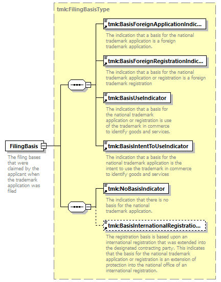| children | tmk:BasisForeignApplicationIndicator tmk:BasisForeignRegistrationIndicator tmk:BasisUseIndicator tmk:BasisIntentToUseIndicator tmk:NoBasisIndicator tmk:BasisInternationalRegistrationIndicator | ||||