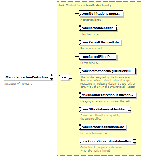 | children | com:NotificationLanguage com:RecordIdentifier com:RecordEffectiveDate com:RecordFilingDate com:InternationalRegistrationNumber tmk:MadridProtectionRestrictionCategory com:OfficeReferenceIdentifier com:RecordNotificationDate tmk:GoodsServicesLimitationBag | ||||