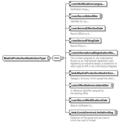 | children | com:NotificationLanguage com:RecordIdentifier com:RecordEffectiveDate com:RecordFilingDate com:InternationalRegistrationNumber tmk:MadridProtectionRestrictionCategory com:OfficeReferenceIdentifier com:RecordNotificationDate tmk:GoodsServicesLimitationBag | ||||