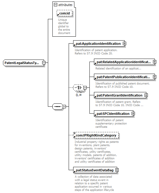 | children | pat:ApplicationIdentification pat:RelatedApplicationIdentification pat:PatentPublicationIdentification pat:PatentGrantIdentification pat:SPCIdentification com:IPRightKindCategory pat:StatusEventDataBag | ||||||||||||||||||||||