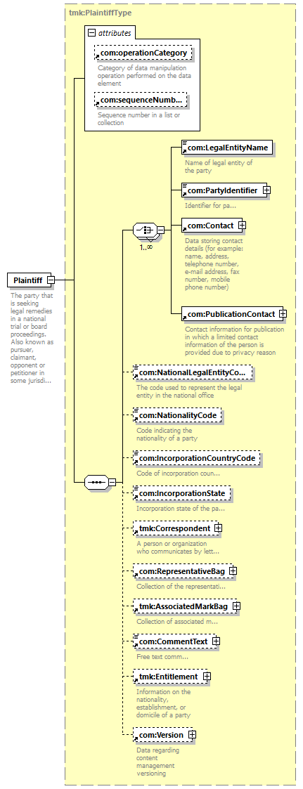 | children | com:LegalEntityName com:PartyIdentifier com:Contact com:PublicationContact com:NationalLegalEntityCode com:NationalityCode com:IncorporationCountryCode com:IncorporationState tmk:Correspondent com:RepresentativeBag tmk:AssociatedMarkBag com:CommentText tmk:Entitlement com:Version | |||||||||||||||||||||||||||||||||