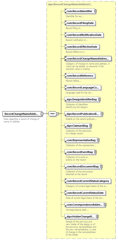 | children | com:RecordIdentifier com:RecordFilingDate com:RecordNotificationDate com:RecordEffectiveDate com:RecordChangeNameAddressCategory com:RecordReference com:RecordLanguageCode dgn:DesignIdentifierBag dgn:RecordPublicationBag dgn:ClaimantBag com:RepresentativeBag com:RecordEventBag com:RecordDocumentBag com:RecordCurrentStatusCategory com:RecordCurrentStatusDate com:CorrespondenceAddress dgn:HolderChangeBag | ||||