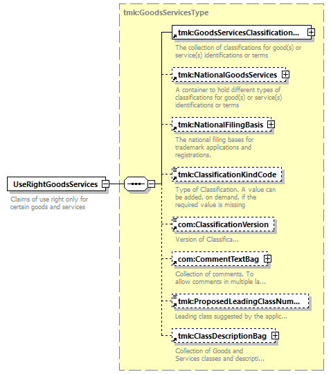 | children | tmk:GoodsServicesClassificationBag tmk:NationalGoodsServices tmk:NationalFilingBasis tmk:ClassificationKindCode com:ClassificationVersion com:CommentTextBag tmk:ProposedLeadingClassNumber tmk:ClassDescriptionBag | ||||