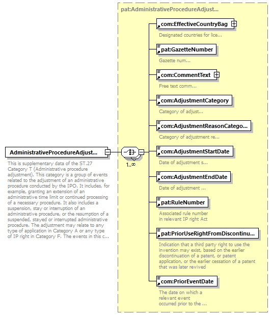 | children | com:EffectiveCountryBag pat:GazetteNumber com:CommentText com:AdjustmentCategory com:AdjustmentReasonCategory com:AdjustmentStartDate com:AdjustmentEndDate pat:RuleNumber pat:PriorUseRightFromDiscontinuationIndicator com:PriorEventDate | ||||