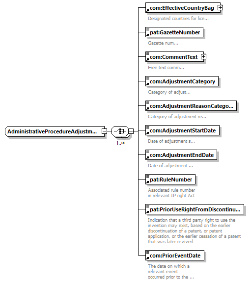 | children | com:EffectiveCountryBag pat:GazetteNumber com:CommentText com:AdjustmentCategory com:AdjustmentReasonCategory com:AdjustmentStartDate com:AdjustmentEndDate pat:RuleNumber pat:PriorUseRightFromDiscontinuationIndicator com:PriorEventDate | ||||