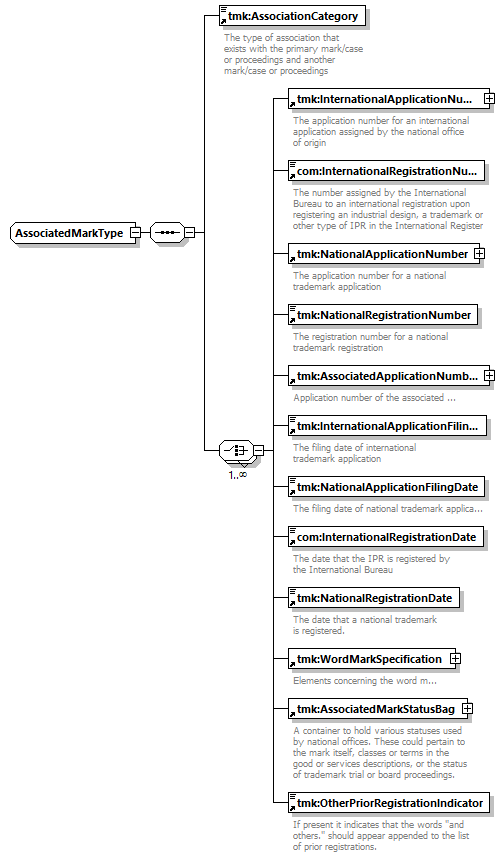 | children | tmk:AssociationCategory tmk:InternationalApplicationNumber com:InternationalRegistrationNumber tmk:NationalApplicationNumber tmk:NationalRegistrationNumber tmk:AssociatedApplicationNumber tmk:InternationalApplicationFilingDate tmk:NationalApplicationFilingDate com:InternationalRegistrationDate tmk:NationalRegistrationDate tmk:WordMarkSpecification tmk:AssociatedMarkStatusBag tmk:OtherPriorRegistrationIndicator | ||||