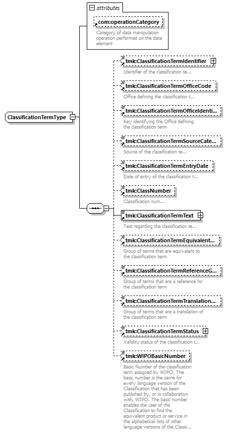 | children | tmk:ClassificationTermIdentifier tmk:ClassificationTermOfficeCode tmk:ClassificationTermOfficeIdentification tmk:ClassificationTermSourceCategory tmk:ClassificationTermEntryDate tmk:ClassNumber tmk:ClassificationTermText tmk:ClassificationTermEquivalentGroup tmk:ClassificationTermReferenceGroup tmk:ClassificationTermTranslationGroup tmk:ClassificationTermStatus tmk:WIPOBasicNumber | ||||||||||||||||||||||