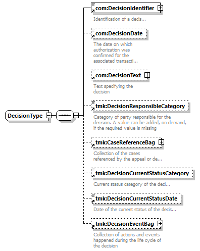 | children | com:DecisionIdentifier com:DecisionDate com:DecisionText tmk:DecisionResponsibleCategory tmk:CaseReferenceBag tmk:DecisionCurrentStatusCategory tmk:DecisionCurrentStatusDate tmk:DecisionEventBag | ||||