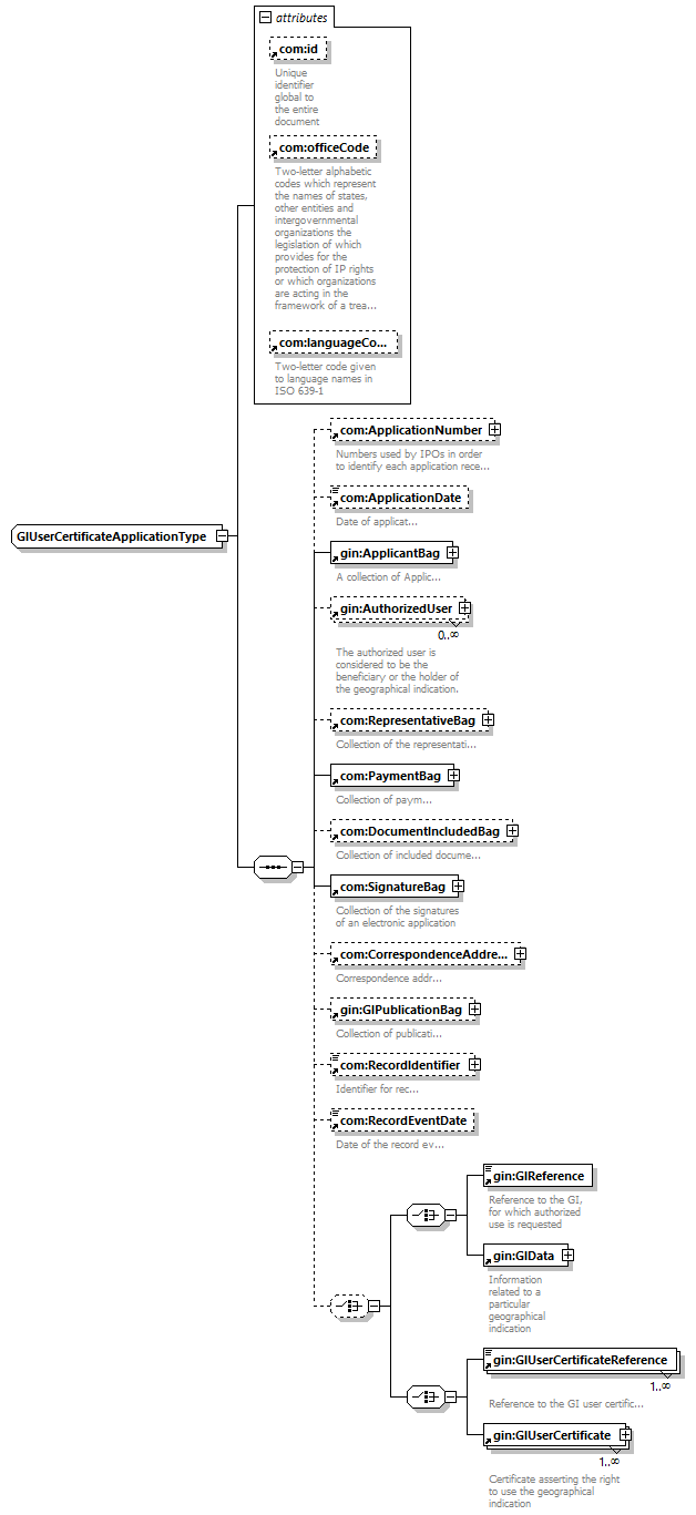 | children | com:ApplicationNumber com:ApplicationDate gin:ApplicantBag gin:AuthorizedUser com:RepresentativeBag com:PaymentBag com:DocumentIncludedBag com:SignatureBag com:CorrespondenceAddress gin:GIPublicationBag com:RecordIdentifier com:RecordEventDate gin:GIReference gin:GIData gin:GIUserCertificateReference gin:GIUserCertificate | ||||||||||||||||||||||||||||||||||||||||||||