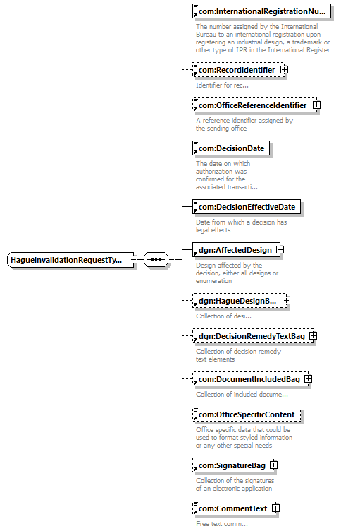 | children | com:InternationalRegistrationNumber com:RecordIdentifier com:OfficeReferenceIdentifier com:DecisionDate com:DecisionEffectiveDate dgn:AffectedDesign dgn:HagueDesignBag dgn:DecisionRemedyTextBag com:DocumentIncludedBag com:OfficeSpecificContent com:SignatureBag com:CommentText | ||||