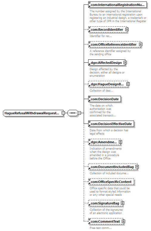 | children | com:InternationalRegistrationNumber com:RecordIdentifier com:OfficeReferenceIdentifier dgn:AffectedDesign dgn:HagueDesignBag com:DecisionDate com:DecisionEffectiveDate dgn:Amendment com:DocumentIncludedBag com:OfficeSpecificContent com:SignatureBag com:CommentText | ||||
