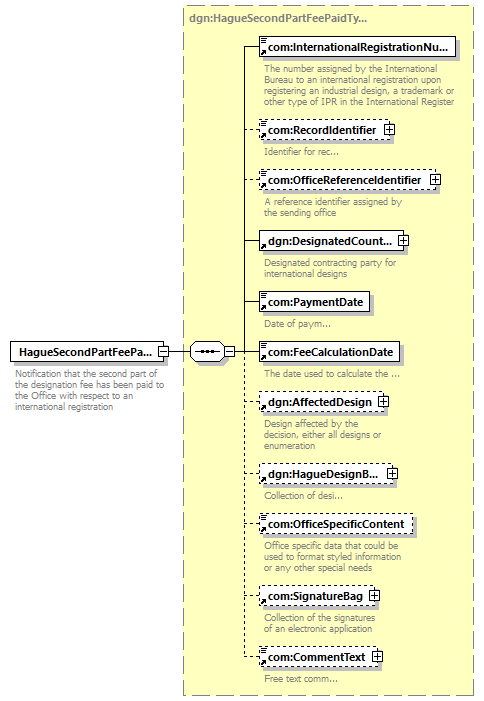 | children | com:InternationalRegistrationNumber com:RecordIdentifier com:OfficeReferenceIdentifier dgn:DesignatedCountry com:PaymentDate com:FeeCalculationDate dgn:AffectedDesign dgn:HagueDesignBag com:OfficeSpecificContent com:SignatureBag com:CommentText | ||||