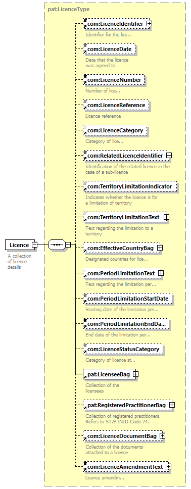 | children | com:LicenceIdentifier com:LicenceDate com:LicenceNumber com:LicenceReference com:LicenceCategory com:RelatedLicenceIdentifier com:TerritoryLimitationIndicator com:TerritoryLimitationText com:EffectiveCountryBag com:PeriodLimitationText com:PeriodLimitationStartDate com:PeriodLimitationEndDate com:LicenceStatusCategory pat:LicenseeBag pat:RegisteredPractitionerBag com:LicenceDocumentBag com:LicenceAmendmentText | ||||