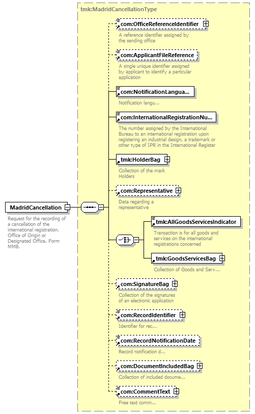 | children | com:OfficeReferenceIdentifier com:ApplicantFileReference com:NotificationLanguage com:InternationalRegistrationNumber tmk:HolderBag com:Representative tmk:AllGoodsServicesIndicator tmk:GoodsServicesBag com:SignatureBag com:RecordIdentifier com:RecordNotificationDate com:DocumentIncludedBag com:CommentText | ||||