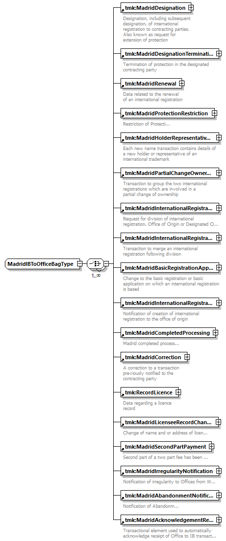 | children | tmk:MadridDesignation tmk:MadridDesignationTermination tmk:MadridRenewal tmk:MadridProtectionRestriction tmk:MadridHolderRepresentativeChange tmk:MadridPartialChangeOwnership tmk:MadridInternationalRegistrationDivision tmk:MadridInternationalRegistrationMerger tmk:MadridBasicRegistrationApplicationChange tmk:MadridInternationalRegistrationCreation tmk:MadridCompletedProcessing tmk:MadridCorrection tmk:RecordLicence tmk:MadridLicenseeRecordChange tmk:MadridSecondPartPayment tmk:MadridIrregularityNotification tmk:MadridAbandonmentNotification tmk:MadridAcknowledgementReceipt | ||||