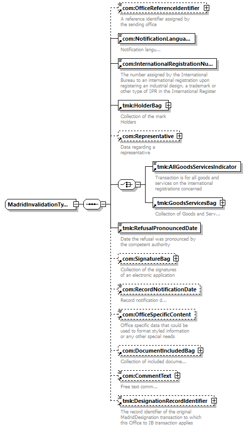 | children | com:OfficeReferenceIdentifier com:NotificationLanguage com:InternationalRegistrationNumber tmk:HolderBag com:Representative tmk:AllGoodsServicesIndicator tmk:GoodsServicesBag tmk:RefusalPronouncedDate com:SignatureBag com:RecordNotificationDate com:OfficeSpecificContent com:DocumentIncludedBag com:CommentText tmk:DesignationRecordIdentifier | ||||