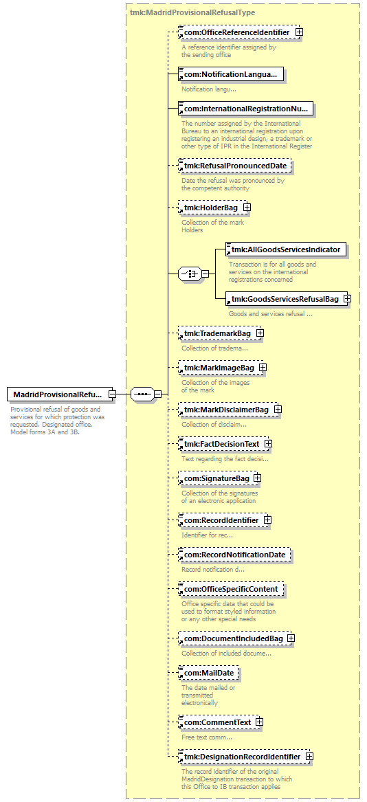 | children | com:OfficeReferenceIdentifier com:NotificationLanguage com:InternationalRegistrationNumber tmk:RefusalPronouncedDate tmk:HolderBag tmk:AllGoodsServicesIndicator tmk:GoodsServicesRefusalBag tmk:TrademarkBag tmk:MarkImageBag tmk:MarkDisclaimerBag tmk:FactDecisionText com:SignatureBag com:RecordIdentifier com:RecordNotificationDate com:OfficeSpecificContent com:DocumentIncludedBag com:MailDate com:CommentText tmk:DesignationRecordIdentifier | ||||