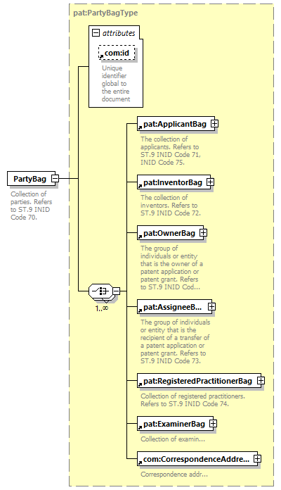 | children | pat:ApplicantBag pat:InventorBag pat:OwnerBag pat:AssigneeBag pat:RegisteredPractitionerBag pat:ExaminerBag com:CorrespondenceAddress | ||||||||||||||||||||||