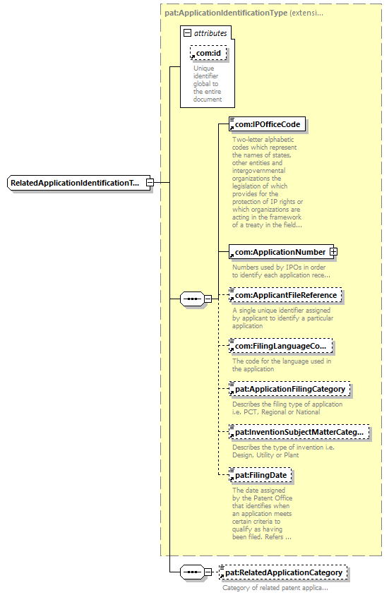 | children | com:IPOfficeCode com:ApplicationNumber com:ApplicantFileReference com:FilingLanguageCode pat:ApplicationFilingCategory pat:InventionSubjectMatterCategory pat:FilingDate pat:RelatedApplicationCategory | ||||||||||||||||||||||