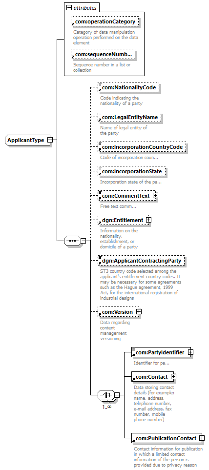 | children | com:NationalityCode com:LegalEntityName com:IncorporationCountryCode com:IncorporationState com:CommentText dgn:Entitlement dgn:ApplicantContractingParty com:Version com:PartyIdentifier com:Contact com:PublicationContact | |||||||||||||||||||||||||||||||||