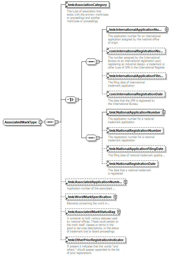 | children | tmk:AssociationCategory tmk:InternationalApplicationNumber com:InternationalRegistrationNumber tmk:InternationalApplicationFilingDate com:InternationalRegistrationDate tmk:NationalApplicationNumber tmk:NationalRegistrationNumber tmk:NationalApplicationFilingDate tmk:NationalRegistrationDate tmk:AssociatedApplicationNumber tmk:WordMarkSpecification tmk:AssociatedMarkStatusBag tmk:OtherPriorRegistrationIndicator | ||||
