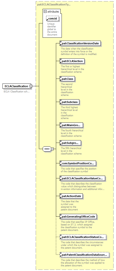 | children | pat:ClassificationVersionDate pat:ECLASection pat:Class pat:Subclass pat:MainGroup pat:Subgroup com:SymbolPositionCode pat:ECLAClassificationValueCode pat:ActionDate pat:GeneratingOfficeCode pat:ECLAClassificationStatusCode pat:PatentClassificationDataSourceCode | ||||||||||||||||||||||