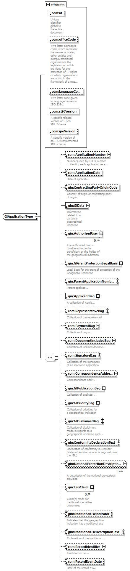 | children | com:ApplicationNumber com:ApplicationDate gin:ContractingPartyOriginCode gin:GIData gin:AuthorizedUser gin:GIGrantProtectionLegalBasis gin:ParentApplicationNumber gin:ApplicantBag com:RepresentativeBag com:PaymentBag com:DocumentIncludedBag com:SignatureBag com:CorrespondenceAddress gin:GIPublicationBag gin:GIPriorityBag gin:GIDisclaimerBag gin:ConformityDeclarationText gin:NationalProtectionDescriptionText gin:TSGClaim gin:TraditionalUseIndicator gin:TraditionalUseDescriptionText com:RecordIdentifier com:RecordEventDate | ||||||||||||||||||||||||||||||||||||||||||||||||||||||||||||||||||