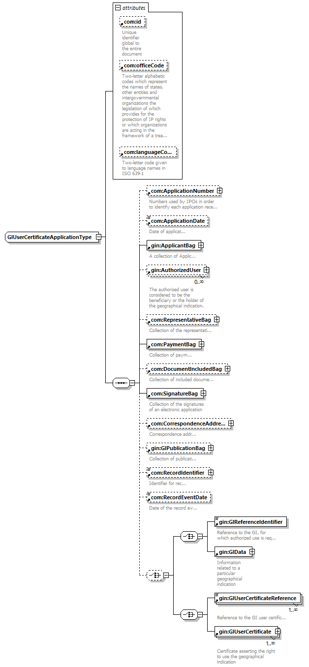| children | com:ApplicationNumber com:ApplicationDate gin:ApplicantBag gin:AuthorizedUser com:RepresentativeBag com:PaymentBag com:DocumentIncludedBag com:SignatureBag com:CorrespondenceAddress gin:GIPublicationBag com:RecordIdentifier com:RecordEventDate gin:GIReferenceIdentifier gin:GIData gin:GIUserCertificateReference gin:GIUserCertificate | ||||||||||||||||||||||||||||||||||||||||||||