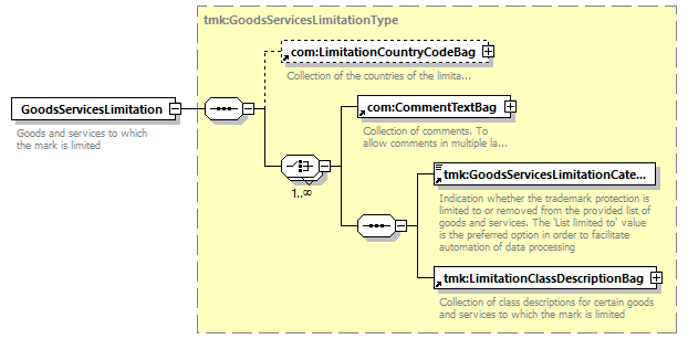 | children | com:LimitationCountryCodeBag com:CommentTextBag tmk:GoodsServicesLimitationCategory tmk:LimitationClassDescriptionBag | ||||