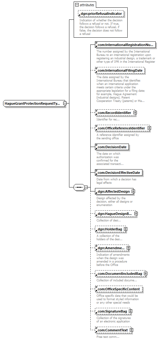 | children | com:InternationalRegistrationNumber com:InternationalFilingDate com:RecordIdentifier com:OfficeReferenceIdentifier com:DecisionDate com:DecisionEffectiveDate dgn:AffectedDesign dgn:HagueDesignBag dgn:HolderBag dgn:Amendment com:DocumentIncludedBag com:OfficeSpecificContent com:SignatureBag com:CommentText | ||||||||||||||||||||||
