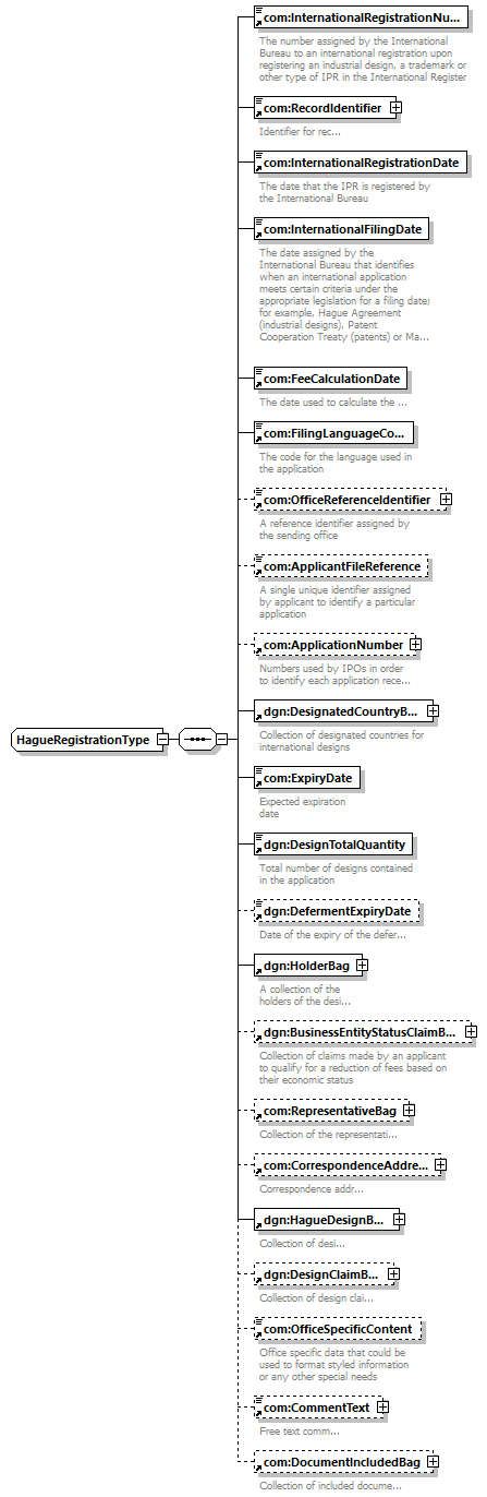 | children | com:InternationalRegistrationNumber com:RecordIdentifier com:InternationalRegistrationDate com:InternationalFilingDate com:FeeCalculationDate com:FilingLanguageCode com:OfficeReferenceIdentifier com:ApplicantFileReference com:ApplicationNumber dgn:DesignatedCountryBag com:ExpiryDate dgn:DesignTotalQuantity dgn:DefermentExpiryDate dgn:HolderBag dgn:BusinessEntityStatusClaimBag com:RepresentativeBag com:CorrespondenceAddress dgn:HagueDesignBag dgn:DesignClaimBag com:OfficeSpecificContent com:CommentText com:DocumentIncludedBag | ||||