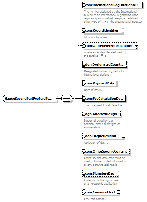 | children | com:InternationalRegistrationNumber com:RecordIdentifier com:OfficeReferenceIdentifier dgn:DesignatedCountry com:PaymentDate com:FeeCalculationDate dgn:AffectedDesign dgn:HagueDesignBag com:OfficeSpecificContent com:SignatureBag com:CommentText | ||||