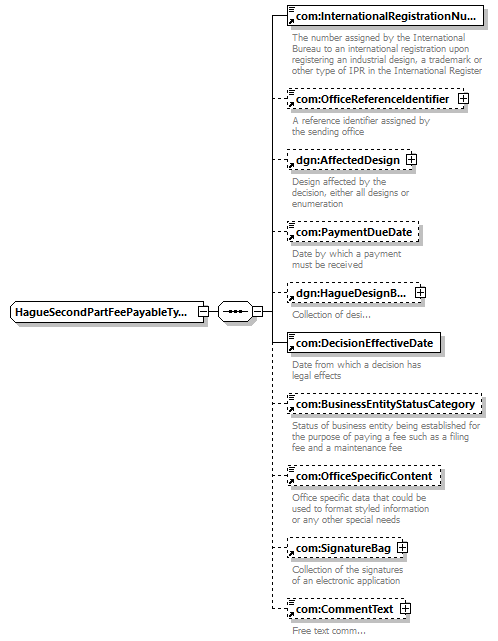 | children | com:InternationalRegistrationNumber com:OfficeReferenceIdentifier dgn:AffectedDesign com:PaymentDueDate dgn:HagueDesignBag com:DecisionEffectiveDate com:BusinessEntityStatusCategory com:OfficeSpecificContent com:SignatureBag com:CommentText | ||||