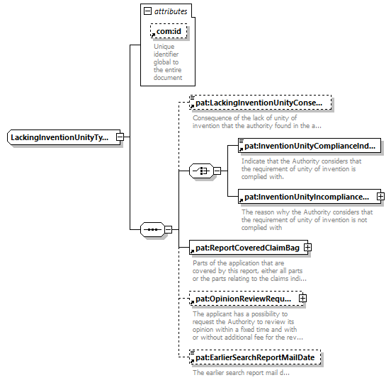 | children | pat:LackingInventionUnityConsequenceCategory pat:InventionUnityComplianceIndicator pat:InventionUnityIncomplianceReason pat:ReportCoveredClaimBag pat:OpinionReviewRequest pat:EarlierSearchReportMailDate | ||||||||||||||||||||||