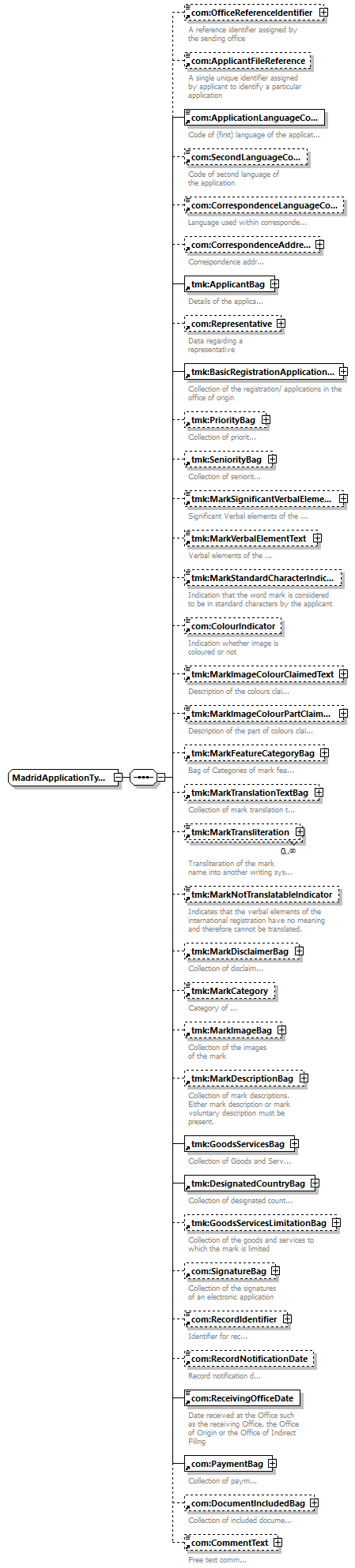 | children | com:OfficeReferenceIdentifier com:ApplicantFileReference com:ApplicationLanguageCode com:SecondLanguageCode com:CorrespondenceLanguageCode com:CorrespondenceAddress tmk:ApplicantBag com:Representative tmk:BasicRegistrationApplicationBag tmk:PriorityBag tmk:SeniorityBag tmk:MarkSignificantVerbalElementText tmk:MarkVerbalElementText tmk:MarkStandardCharacterIndicator com:ColourIndicator tmk:MarkImageColourClaimedText tmk:MarkImageColourPartClaimedText tmk:MarkFeatureCategoryBag tmk:MarkTranslationTextBag tmk:MarkTransliteration tmk:MarkNotTranslatableIndicator tmk:MarkDisclaimerBag tmk:MarkCategory tmk:MarkImageBag tmk:MarkDescriptionBag tmk:GoodsServicesBag tmk:DesignatedCountryBag tmk:GoodsServicesLimitationBag com:SignatureBag com:RecordIdentifier com:RecordNotificationDate com:ReceivingOfficeDate com:PaymentBag com:DocumentIncludedBag com:CommentText | ||||