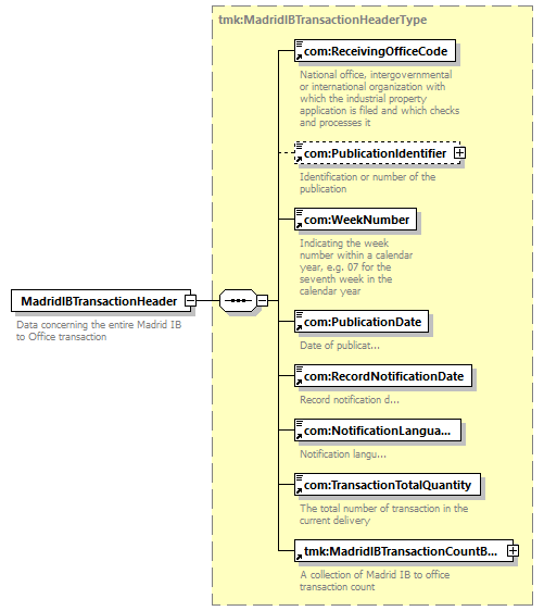 | children | com:ReceivingOfficeCode com:PublicationIdentifier com:WeekNumber com:PublicationDate com:RecordNotificationDate com:NotificationLanguage com:TransactionTotalQuantity tmk:MadridIBTransactionCountBag | ||||