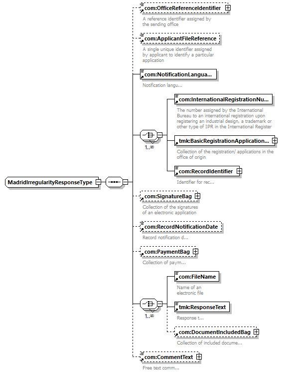 | children | com:OfficeReferenceIdentifier com:ApplicantFileReference com:NotificationLanguage com:InternationalRegistrationNumber tmk:BasicRegistrationApplicationBag com:RecordIdentifier com:SignatureBag com:RecordNotificationDate com:PaymentBag com:FileName tmk:ResponseText com:DocumentIncludedBag com:CommentText | ||||