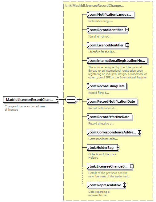 | children | com:NotificationLanguage com:RecordIdentifier com:LicenceIdentifier com:InternationalRegistrationNumber com:RecordFilingDate com:RecordNotificationDate com:RecordEffectiveDate com:CorrespondenceAddress tmk:HolderBag tmk:LicenseeChangeBag com:Representative | ||||