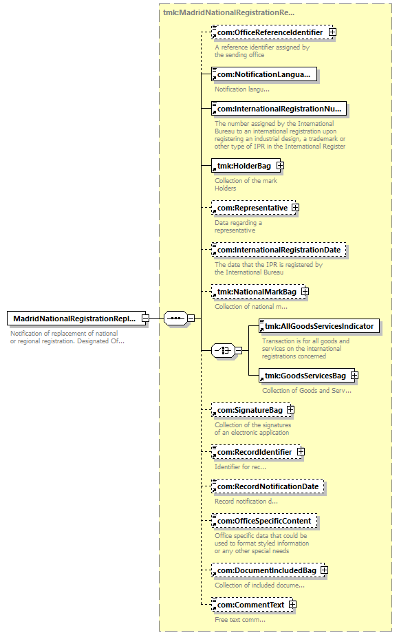 | children | com:OfficeReferenceIdentifier com:NotificationLanguage com:InternationalRegistrationNumber tmk:HolderBag com:Representative com:InternationalRegistrationDate tmk:NationalMarkBag tmk:AllGoodsServicesIndicator tmk:GoodsServicesBag com:SignatureBag com:RecordIdentifier com:RecordNotificationDate com:OfficeSpecificContent com:DocumentIncludedBag com:CommentText | ||||