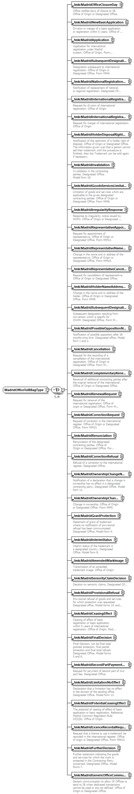 | children | tmk:MadridOfficeClosureDay tmk:MadridNewBasicApplication tmk:MadridApplication tmk:MadridSubsequentDesignation tmk:MadridNationalRegistrationReplacement tmk:MadridInternationalRegistrationDivisionRequest tmk:MadridInternationalRegistrationMergerRequest tmk:MadridHolderDisposalRightRestriction tmk:MadridInvalidation tmk:MadridGoodsServicesLimitationRequest tmk:MadridIrregularityResponse tmk:MadridRepresentativeAppointment tmk:MadridRepresentativeNameAddressChange tmk:MadridRepresentativeCancellation tmk:MadridHolderNameAddressChange tmk:MadridSubsequentDesignationFromConversion tmk:MadridPossibleOppositionNotification tmk:MadridCancellation tmk:MadridComplementaryRenewal tmk:MadridRenewalRequest tmk:MadridCorrectionRequest tmk:MadridRenunciation tmk:MadridCorrectionRefusal tmk:MadridOwnershipChangeNoEffect tmk:MadridOwnershipChange tmk:MadridGrantProtection tmk:MadridInterimStatus tmk:MadridAmendedMarkImage tmk:MadridSeniorityClaimDecision tmk:MadridProvisionalRefusal tmk:MadridCeasingEffect tmk:MadridFinalDecision tmk:MadridSecondPartPaymentRequest tmk:MadridLimitationNoEffect tmk:MadridPotentialCeasingEffect tmk:MadridLicenceRecordalRequest tmk:MadridFurtherDecision tmk:MadridGenericOfficeCommunication | ||||