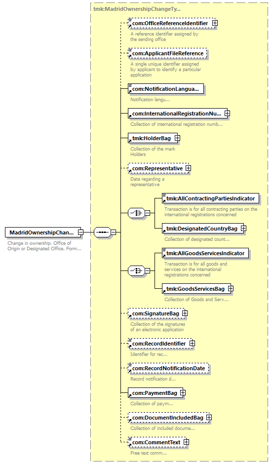 | children | com:OfficeReferenceIdentifier com:ApplicantFileReference com:NotificationLanguage com:InternationalRegistrationNumberBag tmk:HolderBag com:Representative tmk:AllContractingPartiesIndicator tmk:DesignatedCountryBag tmk:AllGoodsServicesIndicator tmk:GoodsServicesBag com:SignatureBag com:RecordIdentifier com:RecordNotificationDate com:PaymentBag com:DocumentIncludedBag com:CommentText | ||||