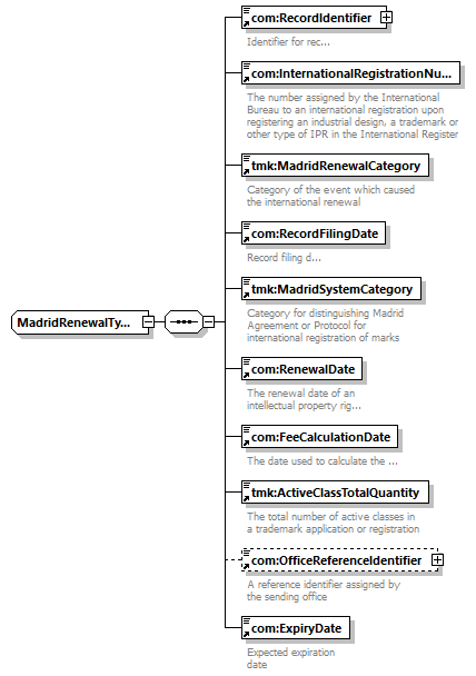 | children | com:RecordIdentifier com:InternationalRegistrationNumber tmk:MadridRenewalCategory com:RecordFilingDate tmk:MadridSystemCategory com:RenewalDate com:FeeCalculationDate tmk:ActiveClassTotalQuantity com:OfficeReferenceIdentifier com:ExpiryDate | ||||