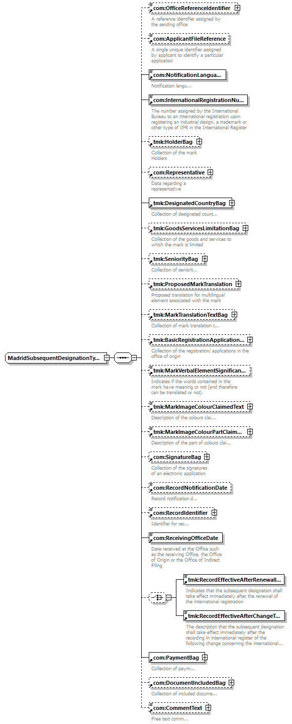 | children | com:OfficeReferenceIdentifier com:ApplicantFileReference com:NotificationLanguage com:InternationalRegistrationNumber tmk:HolderBag com:Representative tmk:DesignatedCountryBag tmk:GoodsServicesLimitationBag tmk:SeniorityBag tmk:ProposedMarkTranslation tmk:MarkTranslationTextBag tmk:BasicRegistrationApplicationBag tmk:MarkVerbalElementSignificantIndicator tmk:MarkImageColourClaimedText tmk:MarkImageColourPartClaimedText com:SignatureBag com:RecordNotificationDate com:RecordIdentifier com:ReceivingOfficeDate tmk:RecordEffectiveAfterRenewalIndicator tmk:RecordEffectiveAfterChangeText com:PaymentBag com:DocumentIncludedBag com:CommentText | ||||