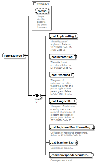 | children | pat:ApplicantBag pat:InventorBag pat:OwnerBag pat:AssigneeBag pat:RegisteredPractitionerBag pat:ExaminerBag com:CorrespondenceAddress | ||||||||||||||||||||||